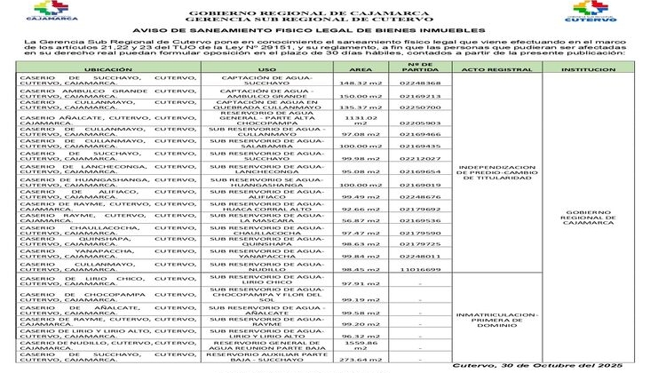 La Gerencia Sub Regional de Cutervo pone en conocimiento el saneamiento físico legal que viene efectuando en el marco de los artículos 21,22 y 23 del TUO de la Ley Nº 29151.